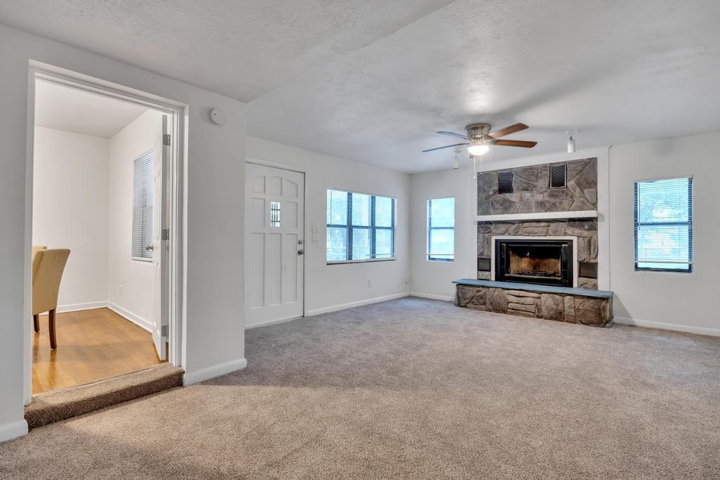 Step into the inviting living room, which features a partial opening to the separate dining room and kitchen. The updated kitchen boasts stainless steel appliances, including a dishwasher, stove, and refrigerator. You'll also find a spacious extra den with a fireplace, which could easily be used as a fourth bedroom.